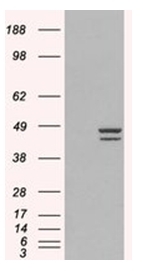 - HEK293 overexpressing IRF2 (RC202102) and probed with AP16059PU-N (mock transfection in first lane), tested by Origene.