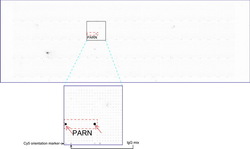 - OriGene overexpression protein microarray chip was immunostained with UltraMAB anti-PARN mouse monoclonal antibody (UM800040). The positive reactive proteins are highlighted with two red arrows in the enlarged subarray. All the positive controls spotted in this subarray are also labeled for clarification.