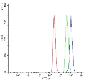 - Flow cytometry testing of mouse RAW264.7 cells with LSM8 antibody at 1ug/million cells (blocked with goat sera); Red=cells alone, Green=isotype control, Blue= LSM8 antibody.