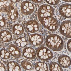 - Immunohistochemical staining of human colon shows strong cytoplasmic positivity in glandular cells.