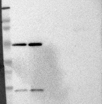- Band of predicted size in kDa (+/-20%) with additional bands present.