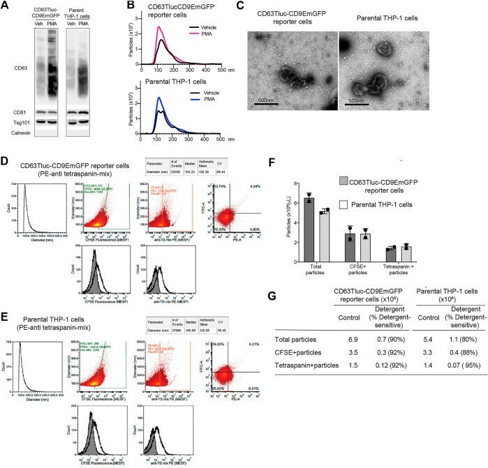 - FIGURE 4 Comparison of EVs released from CD63Tluc-CD9EmGFP reporter cells and parental THP-1 cells. (A-C) 0.5 x 10 6 cells/ml CD63Tluc-CD9EmGFP reporter cells or parental THP-1 cells were treated with 50 ng/ml PMA, 5 uM compounds 81, or 5 for 48 h. EVs were isolated using ExoQuick and were resuspended in particle-free PBS to 1/500 of the original volume of culture supernatant. (A) Immunoblot of EVs isolated from CD63Tluc-CD9EmGFP reporter cells and parental THP-1 cells. EVs (30 ug protein/well) were separated in a 4-12% NuPAGE gel. Blots were probed with anti-CD63, anti-CD81, anti-Tsg101, or anti-Calnexin Abs. The images shown are representative of three independent experiments. The original blots are presented in Supplementary Figure S4 . (B) Size distributions of isolated EVs released from CD63Tluc-CD9EmGFP reporter cells (top) and parental THP-1 cells following treatment with PMA (50 ng/ml) or vehicle as measured by NanoSight. (C) Morphological examination of EVs from vehicle-treated CD63Tluc-CD9EmGFP reporter cells and parental THP-1 cells by transmission electron microscopy. Scale bars represent 500 nm. (D-G) Vesicle flow cytometric (vFC) analysis of EVs isolated from CD63Tluc-CD9EmGFP reporter cells (D,F,G) or parental THP-1 cells (E-G) using differential ultracentrifugation. EVs were stained with vFRed(tm), CFSE, or a mixture of anti-TS antibodies. The gating strategy, positive and negative control samples and isotype staining are presented in Supplementary Figure S8 .