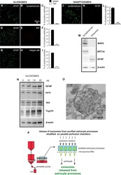 - Figure 1 Astrocyte processes obtained from adult rat cerebral cortex. Negligible contamination of gliosomes, positive for the specific glial marker GFAP (A , D , G) , by subcellular no-astrocytic particles. Immunofluorescent assay for synaptophysin (B) , RIP (E) or integrin-alphaM (H) markers for nerve terminals, microglia, and oligodendrocytes, respectively. As a positive control, the immunofluorescent assay for synaptophysin (J) was performed on cerebral cortical synaptosomes scarcely contaminated by subcellular GFAP-positive particles (K) . Bars (C , F , I , L) represent the percent of positive particles (% +- SEM of positive particles counted in three to five no-overlapping fields from n = 3 different preparations): GFAP (C, F, I, solid bars; L, empty bar), synaptophysin (C empty bar; L solid bar; L, empty bar), or RIP or integrin-alphaM (F or I, respectively; empty bar). Scale bars are indicated in the figures. Western blot analysis of gliosomes and synaptosomes (M , N) . The absence of cross-contamination of the astrocyte processes and nerve terminals is shown (M) : MAP2, beta III tubulin, and GFAP proteins were used as selective markers for the synaptosome or gliosome preparations. Presence of the astrocytic markers GFAP and ezrin, and of the exosome markers Alix and Tsg101 in the gliosomes (N) . Electron microscopy image of a cortical astrocyte processes. A single gliosome is shown containing vesicles scattered in the cytoplasm and a multivesicular body (O) . Scale ba