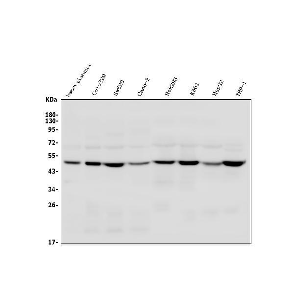 - Western blot analysis of TSG101 using anti-TSG101 antibody (A01233-2). Electrophoresis was performed on a 5-20% SDS-PAGE gel at 70V (Stacking gel) / 90V (Resolving gel) for 2-3 hours. The sample well of each lane was loaded with 50ug of sample under reducing conditions. Lane 1: human placenta tissue lysates, Lane 2: human Colo320 whole cell lysates, Lane 3: human Sw620 whole cell lysates, Lane 4: human Caco-2 whole cell lysates, Lane 5: human Hek293 whole cell lysates, Lane 6: human K562 whole cell lysates, Lane 7: human HepG2 whole cell lysates, Lane 8: human THP-1 whole cell lysates. After Electrophoresis, proteins were transferred to a Nitrocellulose membrane at 150mA for 50-90 minutes. Blocked the membrane with 5% Non-fat Milk/ TBS for 1.5 hour at RT. The membrane was incubated with rabbit anti-TSG101 antigen affinity purified polyclonal antibody (Catalog # A01233-2) at 0.25 μg/mL overnight at 4°C, then washed with TBS-0.1%Tween 3 times with 5 minutes each and probed with a goat anti-rabbit IgG-HRP secondary antibody at a dilution of 1:5000 for 1.5 hour at RT. The signal is developed using an Enhanced Chemiluminescent detection (ECL) kit (Catalog # EK1002) with Tanon 5200 system. A specific band was detected for TSG101 at approximately 44KD. The expected band size for TSG101 is at 44KD.
