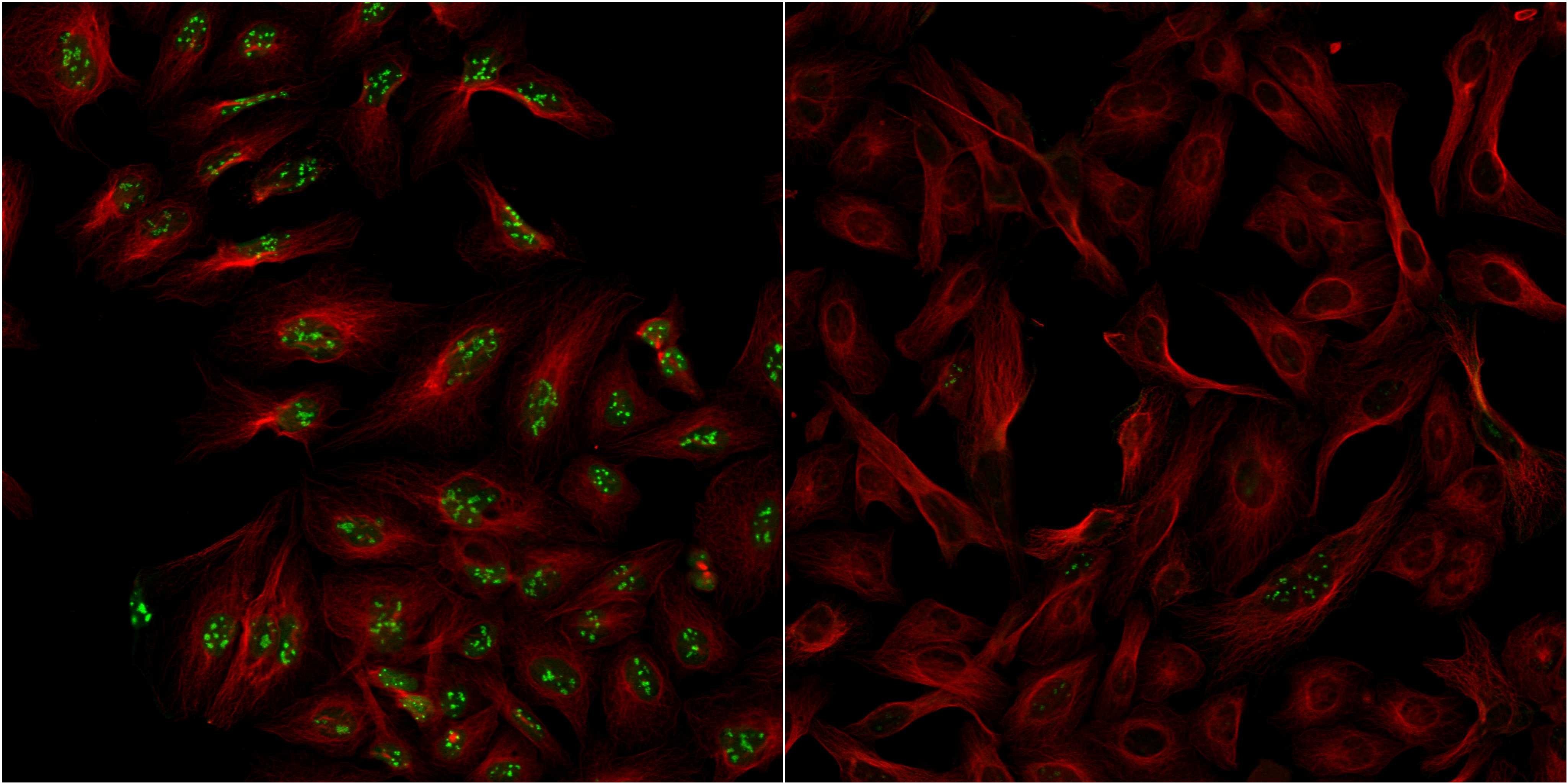 - Confocal images of immunofluorescently stained human U-2 OS cells.The protein UBTF is shown in green and the microtubules in red. The image to the left show cells transfected with control siRNA and the image to the right show cells where UBTF has been downregulated with specific siRNA.