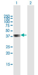 - Western Blot analysis of COL9A1 expression in transfected 293T cell line (H00001297-T01) by COL9A1 MaxPab polyclonal antibody.Lane 1: COL9A1 transfected lysate(36.08 KDa).Lane 2: Non-transfected lysate.
