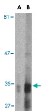 - Western blot analysis of ENDOG expression in HepG2 cell lysate with ENDOG monoclonal antibody, clone 7G1C10 (Cat # MAB2758) at (A) 2.5 and (B) 5 ug/mL .
