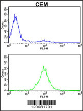 - KPNB1 Antibody (N-term) flow cytometric analysis of CEM cells (bottom histogram) compared to a negative control cell (top histogram).FITC-conjugated goat-anti-rabbit secondary antibodies were used for the analysis.