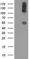 - HEK293T cells were transfected with the pCMV6-ENTRY control (Left lane) or pCMV6-ENTRY CALCOCO2 (RC203843, Right lane) cDNA for 48 hrs and lysed. Equivalent amounts of cell lysates (5 µg per lane) were separated by SDS-PAGE and immunoblotted with anti-CAL. Positive lysates LY417045 (100 µg) and LC417045 (20 µg) can be purchased separately from OriGene.