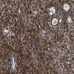- Immunohistochemical staining of human ovary shows strong cytoplasmic positivity in ovarian stromal cells and moderate cytoplasmic staining in follicle cells.