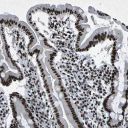 - Immunohistochemical staining of human duodenum shows strong nuclear positivity in glandular cells.