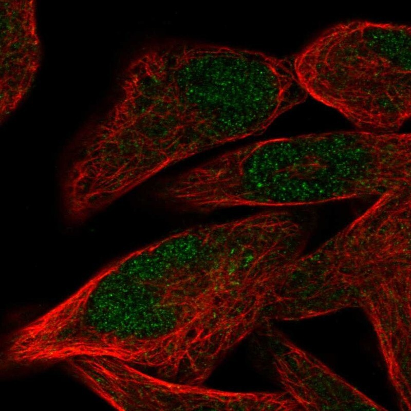 - Immunofluorescent staining of human cell line RH-30 shows localization to nucleus.