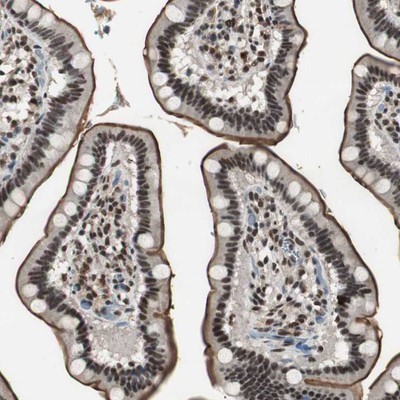 - Immunohistochemistry-Paraffin: Mohawk homeobox Antibody [NBP1-89912] - Staining of human small intestine shows strong membranous and nuclear positivity in glandular cells.