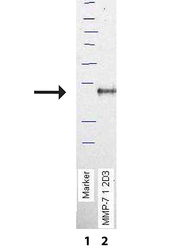 - Western blot analysis of MMP-7 (human), (recombinant) (His-tag) probed with MMP-7, mAb (2D3) (Prod. No. ADI-905-1013) (lane 2). Lane 1 includes a representative MW Marker.