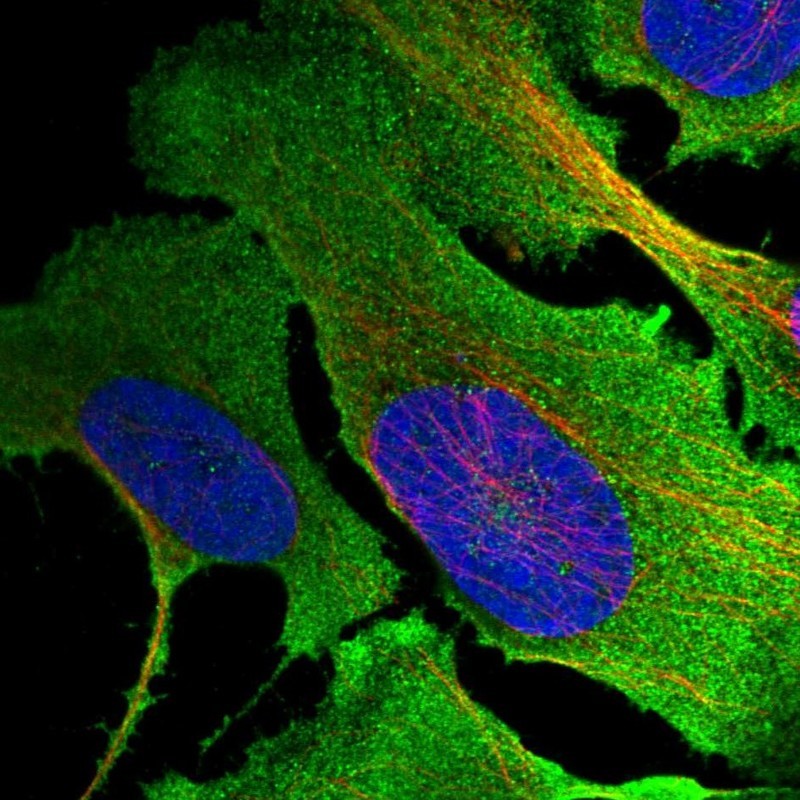 - Immunofluorescent staining of human cell line U-2 OS shows localization to plasma membrane & cytosol.