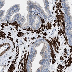 - Immunohistochemical analysis of TMEM180 in human prostate using TMEM180 Polyclonal Antibody (Product # PA5-53707) shows strong cytoplasmic positivity in smooth muscle cells.
