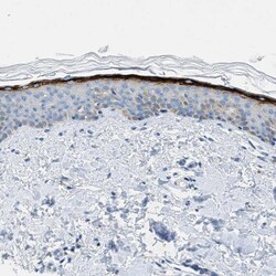 - Immunohistochemical analysis of TMEM180 in human skin using TMEM180 Polyclonal Antibody (Product # PA5-53707) shows strong cytoplasmic positivity in squamous epithelial cells.