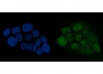 - Immunofluorescent staining of FFPE human A431 cells with ATR antibody (green) and DAPI nuclear stain (blue). HIER: steam section in pH6 citrate buffer for 20 min.