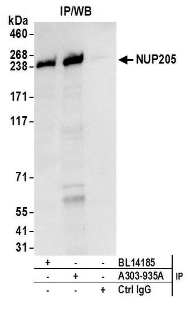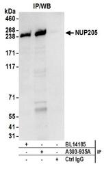 - Detection of human NUP205 by western blot of immunoprecipitates. Samples: Whole cell lysate (1 mg for IP; 20% of IP loaded) from 293T cells. Antibodies: Affinity purified rabbit anti-NUP205 antibody A303-935A (lot A303-935A-1) used for IP at 6 µg/mg lysate. NUP205 was also immunoprecipitated by rabbit anti-NUP205 antibody BL14185. For blotting immunoprecipitated NUP205, A303-935A was used at 1 µg/ml. Detection: Chemiluminescence with an exposure time of 10 seconds.