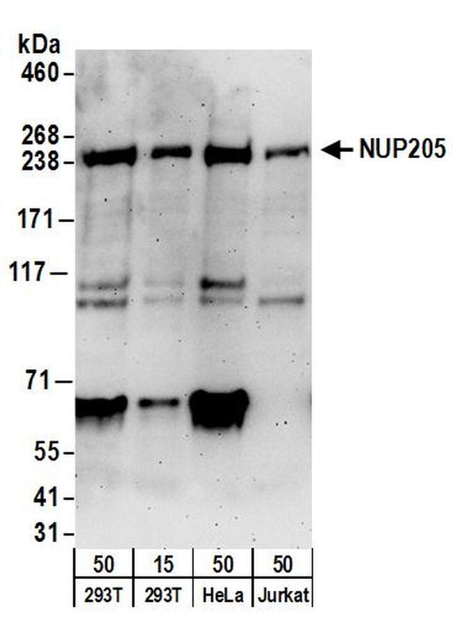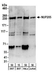 - Detection of human NUP205 by western blot. Samples: Whole cell lysate from 293T (15 and 50 µg), HeLa (50µg), and Jurkat (50µg) cells. Antibodies: Affinity purified rabbit anti-NUP205 antibody A303-935A (lot A303-935A-1) used for WB at 0.1 µg/ml. Detection: Chemiluminescence with an exposure time of 3 minutes.
