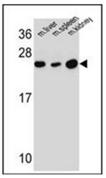 - Western blot analysis of FAM180A Antibody (Center) Cat.-No AP51561PU-N in mouse liver,spleen,kidney tissue lysates (35ug/lane). This demonstrates the FAM180A antibody detected the FAM180A protein (arrow).