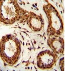 - Formalin fixed and paraffin embedded human breast tissue reacted with FAM180A Antibody (Center) Cat.-No AP51561PU-N followed by peroxidase conjugation of the secondary antibody and DAB staining.
