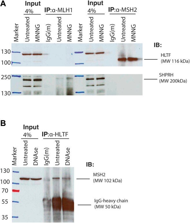 - FIGURE 4 Human homologs of Rad5 HLTF and SHPRH interact with MSH2 and MLH1. (A) HeLa cells were treated with DMSO or 30 muM MNNG and lysates were fractionated to obtain the nuclear fraction. Nuclear fractions were immunoprecipitated with either anti-MLH1 or anti-MSH2 beads and immunoblotted for either HLTF and SHPRH. HLTF co-immunoprecipitated with MSH2. Immunoprecipitated HLTF runs at the predicted molecular weight of 116 kDa, however the non-immunoprecipitated HLTF in the input lanes runs at a slightly higher MW and has several additional bands consistent with the product sheet for the ThermoFisher HLTF antibody. SHPRH co-immunoprecipitated with MLH1 and the interaction is increased after MNNG treatment. (B) HeLa cell nuclear lysates were treated with or without DNAse. Nuclear fractions were obtained and immunoprecipitated with anti-HLTF beads and immunoblotted for MSH2. MSH2 interacts with HLTF regardless of DNAse treatment.