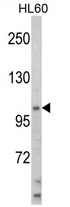 - Western blot analysis of HIP116A Antibody (Center) (AP17466PU-N) in HL60 cell line lysates (35 µg/lane). HIP116A (arrow) was detected using the purified Pab.