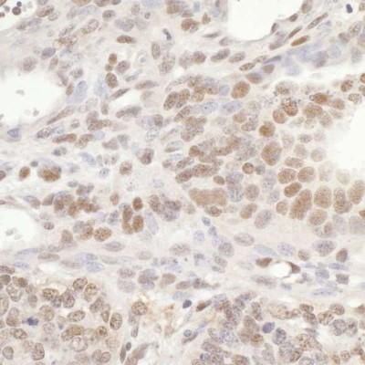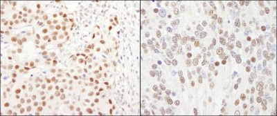 - Immunohistochemistry: GTF3C5 Antibody [NB100-60435] - Sample: FFPE section of human breast carcinoma (left) and mouse teratoma (right). Antibody: Affinity purified rabbit anti- GTF3C5/TFIIIC63 used at a dilution of 1:500 (0.4ug/ml). Detection: DAB