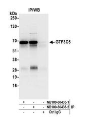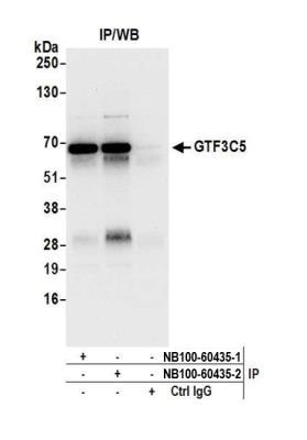 - Immunoprecipitation: GTF3C5 Antibody [NB100-60435] - Detection of human GTF3C5 by western blot of immunoprecipitates. Samples: Whole cell lysate (0.5 or 1.0 mg per IP reaction; 20% of IP loaded) from HEK293T cells prepared using NETN lysis buffer. Antibodies: Affinity purified rabbit anti-GTF3C5 antibody NB100-60435 (lot NB100-60435-2) used for IP at 6 ug per reaction. GTF3C5 was also immunoprecipitated by a previous lot of this antibody (lot NB100-60435-1). For blotting immunoprecipitated GTF3C5, NB100-60435 was used at 0.4 ug/ml. Detection: Chemiluminescence with an exposure time of 10 seconds.