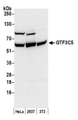 - Western Blot: GTF3C5 Antibody [NB100-60435] - Detection of human and mouse GTF3C5 by western blot. Samples: Whole cell lysate (50 ug) from HeLa, HEK293T, and mouse NIH 3T3 cells prepared using NETN lysis buffer. Antibody: Affinity purified rabbit anti-GTF3C5 antibody NB100-60435 used for WB at 0.1 ug/ml. Detection: Chemiluminescence with an exposure time of 10 seconds.