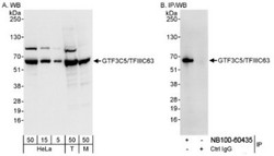 - Western Blot: GTF3C5 Antibody [NB100-60435] - Whole cell lysate from HeLa (5, 15 and 50 ug for WB; 1 mg for IP, 20% of IP loaded), 293T (T; 50 ug), and mouse NIH3T3 (M; 50 ug) cells. NB100-60435 used for WB at 0.04 ug/ml (A) and 1 ug/ml (B) and used for IP at 3 ug/mg lysate.