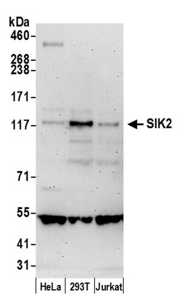 - Detection of human SIK2 by western blot. Samples:Whole cell lysate (50 µg) from HeLa, 293T, and Jurkat cells prepared using NETN lysis buffer. Antibody: Affinity purified rabbit anti-SIK2 antibody A302-676A (lot A302-676A-2) used for WB at 0.1 µg/ml. Detection:Chemiluminescence with an exposure time of 3 minutes.