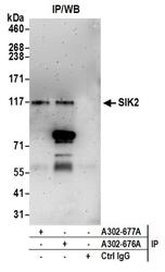 - Detection of human SIK2 by western blot of immunoprecipitates. Samples: Whole cell lysate (1.0 mg per IP reaction; 20% of IP loaded) from 293T cells prepared using NETN lysis buffer. Antibodies: Affinity purified rabbit anti-SIK2 antibody A302-676A (lot A302-676A-2) used for IP at 3 µg per reaction. SIK2 was also immunoprecipitated by rabbit anti-SIK2 antibody A302-677A. For blotting immunoprecipitated SIK2, A302-676A was used at 1 µg/ml. Detection: Chemiluminescence with an exposure time of 3 minutes.