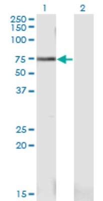 - Western Blot: PWP1 Antibody (1A12) [H00011137-M03] - Analysis of PWP1 expression in transfected 293T cell line by PWP1 monoclonal antibody (M03), clone 1A12. Lane 1: PWP1 transfected lysate (Predicted MW: 55.9 KDa). Lane 2: Non-transfected lysate.