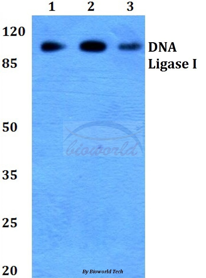 - Western blot (WB) analysis of DNA Ligase I (E139) pAb at 1:500 dilutionLane1:Hela cell lysateLane2:Raw264.7 cell lysateLane3:H9C2 cell lysate