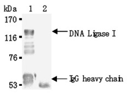 - Immunoprecipitation of DNA Ligase I from Jurkat cells with AM26565AF-NÂ (1) or mouse IgG1 (2). After immunoprecipitated with the antibody, immunocomplex was resolved on SDS-PAGE and immunoblotted with AM26565AF-N.