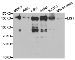 - Western blot analysis of extracts of various cell lines, using LIG1 antibody.