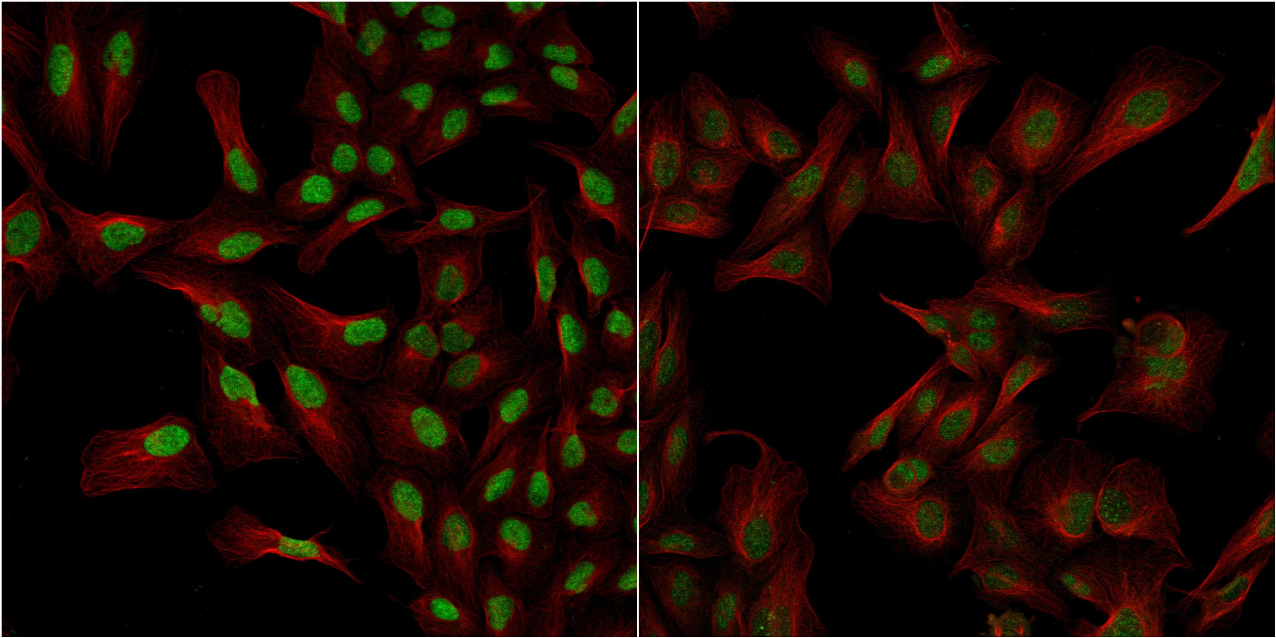 - Confocal images of immunofluorescently stained human U-2 OS cells.The protein VEZF1 is shown in green and the microtubules in red. The image to the left show cells transfected with control siRNA and the image to the right show cells where VEZF1 has been downregulated with specific siRNA.