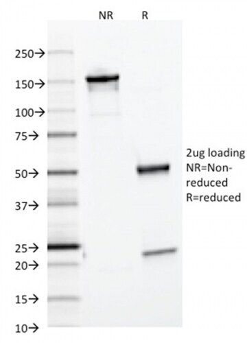 - SDS-PAGE Analyis Purified Ferritin, Light Chain Monoclonal Antibody (Product # 2512-MSM1-P1ABX). Confirmation of Purity and Integrity of Antibody.