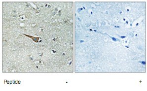- Immunohistochemistry analysis of paraffin-embedded human brain tissue using SFT2D3 antibody. The picture on the right is treated with the synthesized peptide.