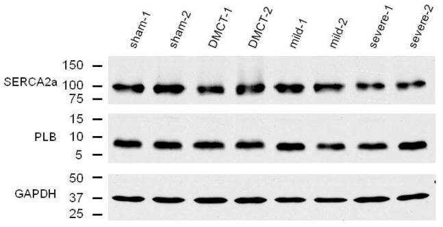 - Fig 2 Left atrial expression of Ca 2+ handling proteins. (A) Original Western blots of Ca 2+ handling proteins from Sham and AoB LA. Note the GAPDH blots for normalization. (B) Mean band intensity expressed relative to Sham as 100%. Data represent mean +- SEM from 6 Sham and 6 AoB hearts. *, P
