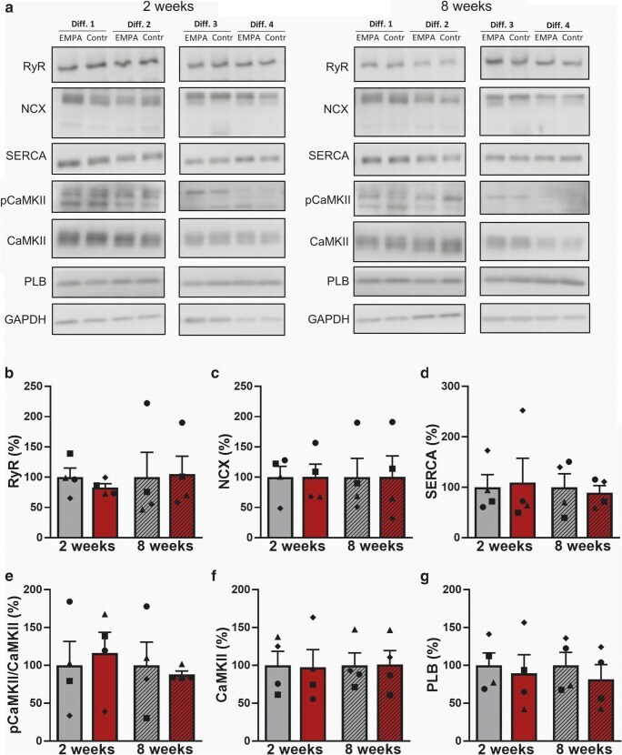 - Fig. 6 Western blot of EC-coupling proteins in human-induced pluripotent stem cell cardiomyocytes (iPSC-CM). ( a ) Representative original Western blots after treatment with empagliflozin (EMPA) or vehicle control (control) for 2 or 8 weeks from 4 differentiation experiments (Diff.) from 2 healthy donors. GAPDH was used as loading control. ( b ) Mean protein expression levels (normalized to the respective control group at 2 or 8 weeks) in iPSC-CM ( n = 4 differentiations, matched groups are displayed with matched individual symbols) and effects of 2 and 8 weeks treatment with empagliflozin (EMPA) on ryanodine-receptor type 2 (RyR2), ( c ) sodium-calcium exchanger (NCX), ( d ) sarcoplasmic reticulum Ca 2+ ATPase (SERCA), ( e ) phosphorylated Ca 2+ -/calmodulin-dependent protein kinase II (pCaMKII), ( f ) Ca 2+ -/calmodulin-dependent protein kinase II (CaMKII), and ( g ) phospholamban (PLB). Groups were statistically analyzed using two-way ANOVA with Sidak's test for multiple comparisons
