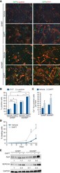 - Figure 3 Notch Inhibition Cooperates with AKT1 to Enhance Cardiac Reprogramming alphaMHC-GFP MEFs (or GCaMP MEFs in C) were infected with GHMT or AGHMT, and treated with DMSO (vehicle) or DAPT. (A) Representative immunostaining images of GFP, alpha-actinin, and cTnT at day 15 of reprogramming. Scale bar, 200 mum. (B) Quantification of cells positive for alpha-actinin and cTnT as determined by immunostaining; n = 3 biological replicates. (C) Quantification of Ca 2+ flux-positive cells in GCaMP MEFs at day 15; n = 3 biological replicates. (D) Percentage of beating cells, relative to the number of input cells; n = 3 biological replicates. (E) Immunoblot against the Ca 2+ handling proteins ryanodine receptor (RyR) and SERCA2 at day 15 of reprogramming. Densitometric quantification is shown as the average of every replicate, relative to GAPDH. Data are presented as mean +- SD. * p < 0.05, ** p < 0.01, *** p < 0.001.