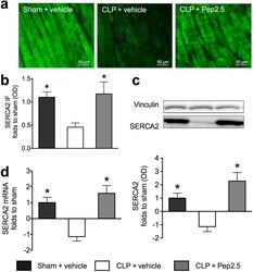 - Figure 4 Effect of cecal ligation and puncture and treatment with Pep2.5 on SERCA2 expression in murine heart tissue. After CLP or sham 2-month-old male NMRI mice were treated with Pep2.5 (2.0 mug/h in saline 0.9%) or vehicle (100 mul/h saline 0.9%). ( a ) Representative immunofluorescence images of heart with antibodies reactive to sarcoplasmic reticulum Ca 2+ -ATP-ase (SERCA2) (green). ( b ) Quantification of SERCA2 expression in heart tissue was assessed 24 subsequent to sham or CLP by immunofluorescence and shown as relative optical density (OD); ( c ) Representative immunoblot of SERCA2 (bottom) and vinculin (top). OD of SERCA2 bands corrected for the corresponding vinculin bands and normalized using the related sham band; ( d ) Relative mRNA expression of SERCA2 corrected for S7 expression and normalized to sham. The following groups were studied: sham + vehicle (n = 8); CLP + vehicle (n = 8); CLP + Pep2.5 (n = 8). Data are expressed as means +- SD for n number of observations. * P < 0.05 vs. CLP + vehicle (Kruskall-Wallis test with Dunn's multiple comparisons test).