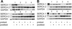 - Fig. 4 Immunoblot with pre- and post-test expression of SERCA1 (~ 110 kDa), SERCA2 (~ 110 kDa) and GAPDH (~ 37 kDa) in muscle biopsies from participants 1-8 in A maximal strength training group and B control group