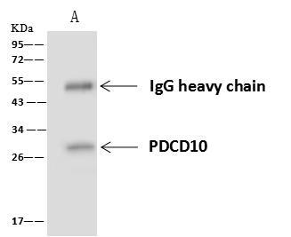 - PDCD10 was immunoprecipitated using: Lane A: 0.5 mg HeLa Whole Cell Lysate. 4 uL anti-PDCD10 rabbit polyclonal antibody and 60 ug of Immunomagnetic beads Protein A/G. Primary antibody: Anti-PDCD10 rabbit polyclonal antibody, at 1:100 dilution. Secondary antibody: Goat Anti-Rabbit IgG (H+L)/HRP at 1/10000 dilution. Developed using the ECL technique. Performed under reducing conditions. Predicted band size: 25 kDa. Observed band size: 28 kDa.