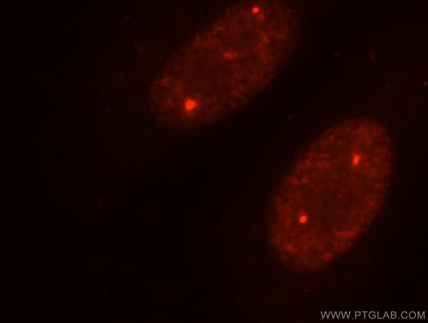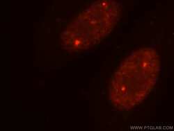 - Immunofluorescent analysis of HepG2 cells, using TOE1 antibody 16203-1-AP at 1:25 dilution and Rhodamine-labeled goat anti-rabbit IGG (red).