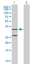- Western Blot analysis of CCDC44 expression in transfected 293T cell line (H00051204-T01) by CCDC44 MaxPab polyclonal antibody.Lane 1: CCDC44 transfected lysate(32.67 KDa).Lane 2: Non-transfected lysate.