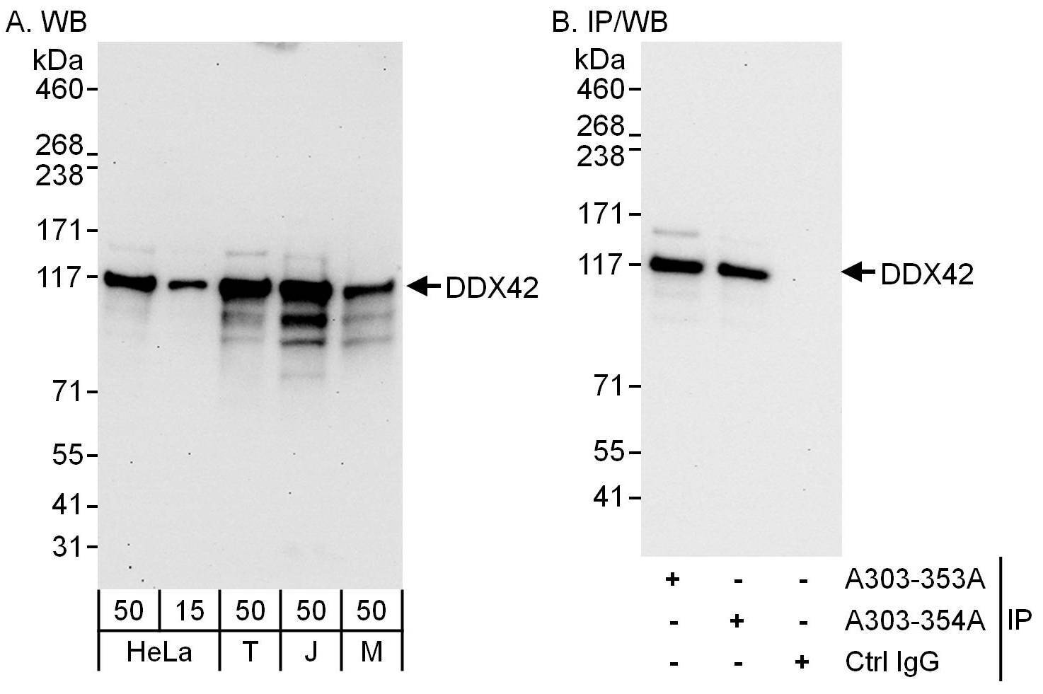 - Detection of human and mouse DDX42 by western blot (h and m) and immunoprecipitation (h). Samples: Whole cell lysate from HeLa (15 and 50 µg for WB; 1 mg for IP, 20% of IP loaded), 293T (T; 50 µg), Jurkat (J; 50 µg) and mouse NIH3T3 (M; 50 µg) cells. Antibodies: Affinity purified rabbit anti-DDX42 antibody A303-354A used for WB at 0.1 µg/ml (A) and 1 µg/ml (B) and used for IP at 6 µg/mg lysate. DDX42 was also immunoprecipitated by rabbit anti-DDX42 antibody A303-353A, which recognizes an upstream epitope. Detection: Chemiluminescence with exposure times of 30 seconds (A) and 10 seconds (B).